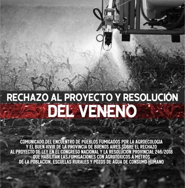 Las asambleas ambientales, las organizaciones sociales y las comunidades articuladas en el Encuentro de Pueblos Fumigados por la Agroecología y el Buen Vivir de la Provincia de Buenos Aires, expresamos nuestro enérgico rechazo al “Proyecto de Ley del Veneno” que se discute en el Congreso Nacional —disfrazado de “presupuestos mínimos” para permitir fumigaciones a 10 metros en modalidad terrestre y 45 metros en aérea— y a la “Resolución del Veneno” (246/2018) del Gobierno bonaerense que, con mayor temeridad aún, llega a habilitar cero metro para aplicaciones terrestres.