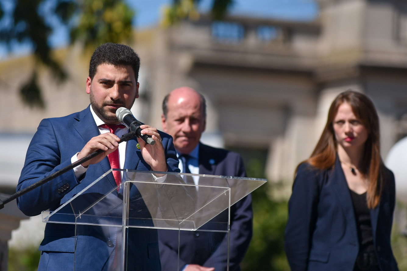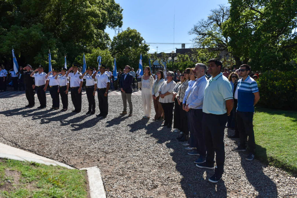 El jefe comunal lo hizo acompañado por funcionarios de su gabinete, del presidente del HCD, Javier De Marcos, vecinos, la Banda Municipal, Bomberos Voluntarios, Fuerzas de Seguridad, Veteranos de la Guerra de Malvinas, y representantes de distintas instituciones locales.